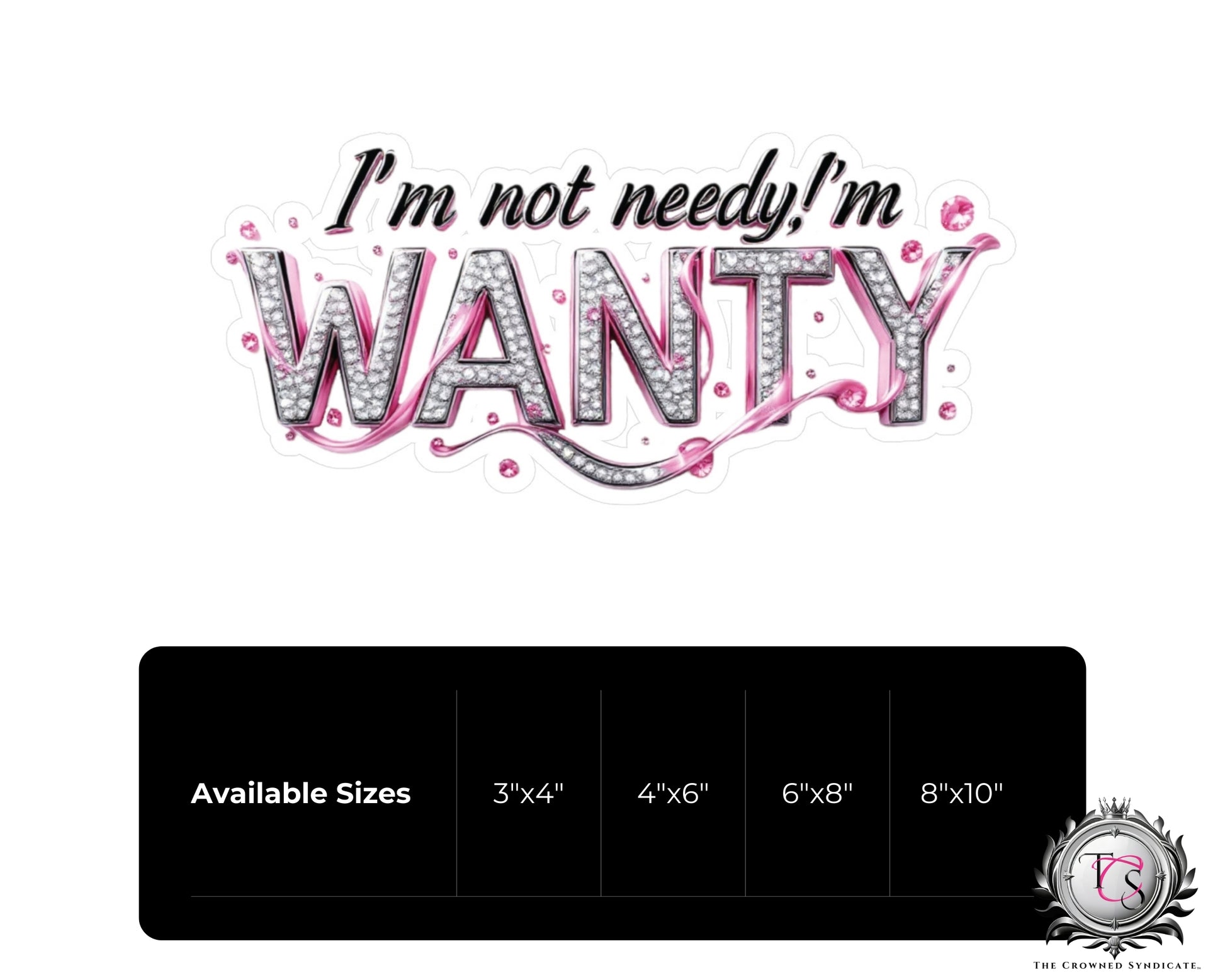 The "I'm Not Needy, I'm Wanty" vinyl decal delivers glam with a wink and just enough bite. Perfect for adding snark to your workspace, car, or coffee tumbler.